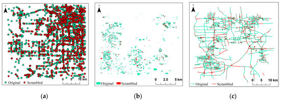 Comparison of different types of data and original data after a feature order scrambling attack: (a) Point type vector data; (b) Line type vector data; (c) Polygon type vector data.