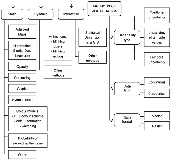 Data uncertainty visualisation techniques and relevant data properties can be modelled with a formalised diagram. The data uncertainty visualisation methods model is a set of principles for describing data set uncertainty with visual variables. The model in Figure 1 links visualisation techniques to data uncertainty properties. Visualisation methods are classified into three primary categories depending on the interaction: static, dynamic, and interactive [19].
