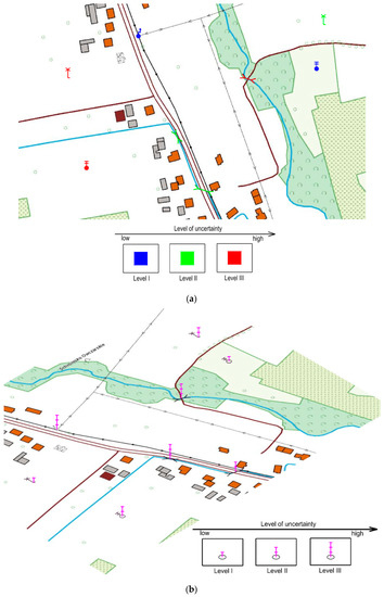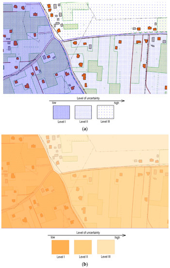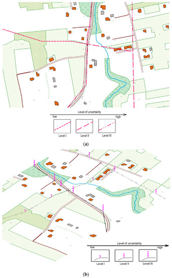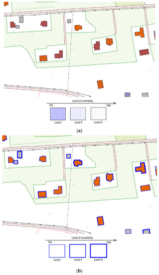 The authors have defined a set of uncertainty visualisation methods for data in the DTO based on an analysis of reference literature and their experience and research [37,38,39] on the quality of data in official spatial databases. This set contains visualisation techniques for presenting three types of uncertainty: positional, attribute, and temporal uncertainty. The positional uncertainty was defined for point, linear, and surface objects using two variables:attribute value uncertainty and temporal uncertainty. They describe such aspects as completeness or currency of sets and are represented using two visual variables.