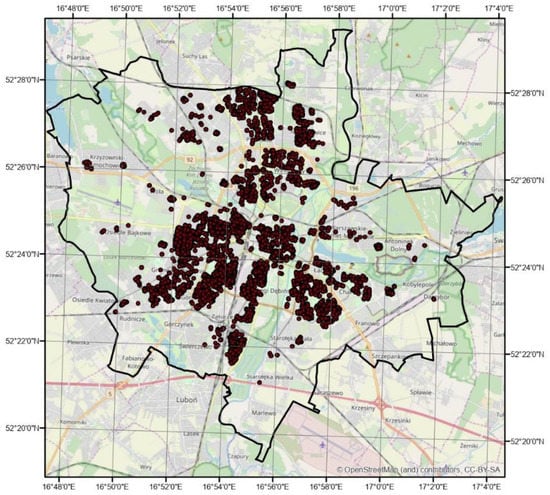 Poznań is situated in the Wielkopolskie Province in central–western Poland. It is the fifth-largest town in Poland by inhabitants (537,682 in 2018 year) and the eighth largest by size (262 sq km). Data on apartment sales from 2013 to 2017 were obtained from the Geodesy and Municipal Cadastre in Poznań. This research only refers to dwellings in multi-family buildings (apartments). In the case of Poland, the majority of dwellings are located in multi-family buildings (around 90% in the case of big cities). The scarcity of transactions, as well as lack of full descriptions of single-family houses in notarial deeds, could lead to biases and misinterpretation of the maps prepared using such a dataset. Data on transactions included all types of properties, both residential and non-residential (e.g., commercial properties or garages). In the data-cleaning process, sales of more than one residential unit and non-free market transactions (e.g., debt-collector sales) were removed. The final dataset contained 12,219 geocoded apartments transactions for the years 2013–2017 (Figure 1).