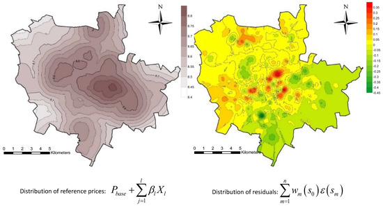 The model price layer was obtained by substituting in the regression model the values of features corresponding to the reference property and the values resulting from rasters representing distances. The residual layer was obtained by spatial interpolation using the ordinary kriging method. Figure 2 presents a map of prices (in natural logarithms) resulting from the model and a map of the spatial distribution of the residuals.