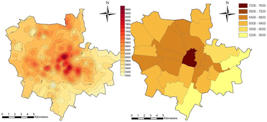 In the estimation of the density of a phenomenon, each measurement object is replaced by a value calculated according to the probability density function, and then function values are added to obtain an aggregate surface or continuous density field [48]. Depending on the purpose of the study, the type of data, and the expected results different forms of kernel functions are used, e.g., Epanechnikov kernel, monoblock, bivalve, or normal [49]. The value of the smoothing parameter has a fundamental influence on the quality of the kernel estimator. If the value is too low, a significant number of local extremes appears, which may contradict the actual properties of the real population. On the other hand, too high values of the h parameter result in excessive smoothing of the estimator, masking the specific features of the studied distribution [49]. Kernel estimation has been used for many years, especially in system analysis [50], but there are few studies presenting its application to spatial analyses of the real estate market. Examples of applications of this method include, for example, estimating population density and structure [51], access to retail centers [46], or analysis of access to public health services [52]. Modelling the surface area representing the density of spatial phenomena also allows determination of the correlation between these phenomena. An example is the analysis of relations between the spatial configuration of a communication system and various socio-economic indicators concerning the local community [53]. The use of kernel estimation for spatial analysis of the real estate market may consist not only in the assessment of density but also in the assessment of the intensity of a given phenomenon. This methodology may be especially useful for the creation of cartographic studies concerning, among others, the number of transactions, traffic intensity, the intensity of buildings, or changes in ownership in spatial terms [54].