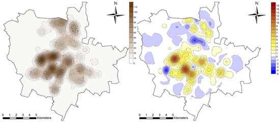 Market activity was shown on maps as a distribution of the density of points corresponding to the location of the transaction. For this purpose, the kernel function in the form of a two-weighted kernel [47] was used. The smoothing parameter was adopted as h = 1000 m. As a result, a continuous surface was obtained, which represents the density of the analyzed phenomenon. Due to the fact that the analysis covered five years, the average density calculated independently for each year of the analysis was presented. As a supplement, a map of the average annual change in market activity, represented by the average annual increase (or decrease) in the number of transactions per unit area, expressed in absolute values, was prepared. These maps are presented in Figure 4.