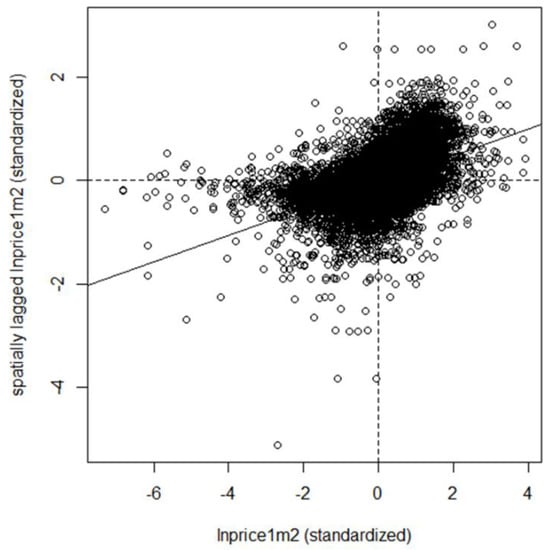 The use of spatial models, including the GWR model, is justified when the phenomenon of spatial autocorrelation of the explained variable occurs. This means that prices of properties located close to each other should be similar. Figure 5 presents a Moran chart for standardized logarithms of unit transactional prices and the results of the global autocorrelation test (Moran I statistics).