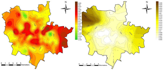 The analysis of the price dynamics map allows for identification of the areas of the city where the dynamics of price changes clearly differ from the typical value (about 4% per year). The map allows identification of areas perceived as more or less attractive in the opinion of buyers. Controlling the physical characteristics and quality elements of the property, the price dynamics maps allow one to highlight and assign price volatility to specific locations. The distribution of errors in determining the price change coefficient is naturally related to the distribution of the number of transactions. The highest error value concerns the areas where only single transactions occurred. It must be stated that Figure 5 (right map) shows the distribution of errors so that it is visible where there are few transactions, and because of that the trend in price changes is more prone to bias. The information value is not only about where the trend is but also about how accurate it is.