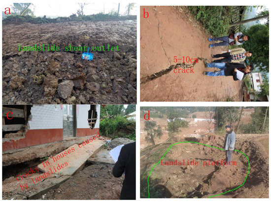 Tensile cracks are developed on the rural road and the upper slope at the back edge of the landslide. Fracture zones are formed with a width of about 1–2 m in local areas, the width of ground cracks varying from 5 to 10 cm (Figure 4b). The house near the boundary was badly cracked (Figure 4c). Due to the deformation, the landslide platform was formed locally with a height of 1 m. (Figure 4d).