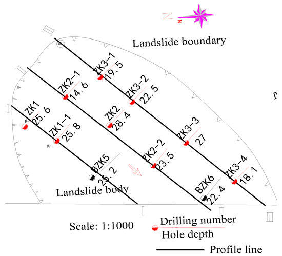 In order to understand the landslide situation better and provide geological data for the slope treatment, we carried out detailed engineering geological investigations. In the landslide survey, three profile lines and nine boreholes were set up, and BZK5, BZK6 boreholes were added to understand the geological conditions in detail. Locations are shown in Figure 5.