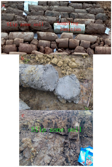 According to field geological survey data and drilling holes, the slip zone soil was silty clay (Figure 6a), with a thickness of 30–70 cm, mostly yellow-brown, partly reddish-brown and grey-green (Figure 6b), saturation and plastic-soft plastic state. Scratches and folds of the landslide could be seen from the boreholes and shear outlets of the sliding zone soil. (Figure 6c).