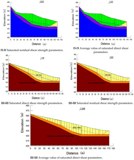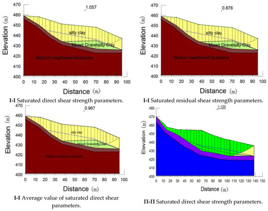 The stability was analyzed by GeoStudio-SlOPE/W, based on the Morgenstern—Price approach of limit equilibrium. According to laboratory test results and parameters of saturated direct shear test, saturated residual shear test and average shear strength, numerical simulation of landslide stability was carried out. The numerical simulation figures are shown in Figure 7.