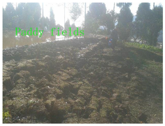 Rainfall is abundant in landslide areas, and there are a large number of paddy fields above the slope. Because a large amount of surface water infiltrates downward, soil properties are poor (Figure 9).