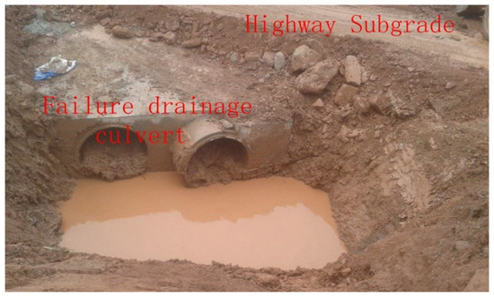 Surface water and groundwater were developed in the slope. The drainage culvert of section K134 + 930 could not drain effectively, which made groundwater gather at the foot of the slope. (Figure 10). The saturation and softening soil gradually reduced the strength of the soil, which caused the failure of the anti-slide piles. The failure of No. 40#–43# anti-slide pile further aggravated the development of the landslide.
