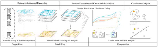 We are proposing an analytical framework adapted from Spadon et al. [], as shown in Figure 1, which includes three steps: data acquisition, characterizing urban street networks, and investigating the relationship between urban street networks and economic development. First, we acquired cities’ street network data from OpenStreetMap using OSMnx [], a software for downloading spatial entities and for modeling, projecting, visualizing, and analyzing complex street networks from OpenStreetMap’s Application Programming Interfaces (APIs). Street networks (graphs) were then constructed using the obtained OSM street data. In this paper, we consider street intersections as nodes and the street segment between each pair of street intersections as edges in the network. The lengths of the edges are considered weights in the network.
