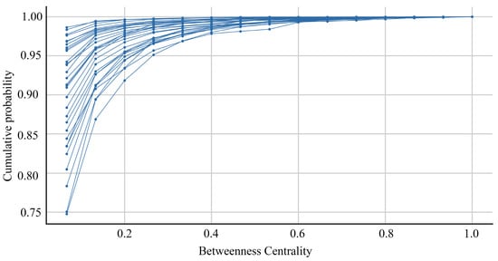 The cumulative probability distribution of street network betweenness centrality.