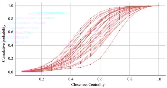 Closeness centrality evaluates the degree of proximity of one node to all the other nodes in a network [,,]. It is the reciprocal of the sum of the distance from one node to all others in the network. Since the sum of distances depends on the number of nodes in the graph, closeness is normalized by the sum of the minimum possible distances N − 1. A node will be considered more central if it is closer to other nodes on average. Closeness centrality is defined as
