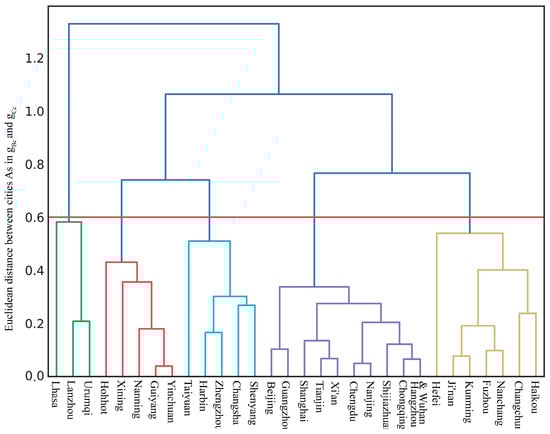 We then investigated the relationship between the morphology and structure of a city’s street networks and the city’s economic development by comparing the HCA clustering results with GDP and population of the cities in the study with the division of Chinese major economic regions. Studied cities were clustered based on the characteristics of their street network’s morphology and structure using Gini coefficient analysis and HCA. The Gini coefficient is a commonly used measurement in the fields of economics and ecology for describing inequalities in the distributions of the given resource among the individuals of a population []. In this study, we calculated the Gini coefficient of a street network’s betweenness and closeness centrality to present the heterogeneity of the distribution of centrality among street nodes in a city. We then employed HCA based on the Gini coefficient of a street network’s centrality. The complete linkage method, based on the largest distance between cities in the different clusters, was applied in the HCA. By choosing a maximum distance equal to 0.6 for two cities to belong to the same cluster, we identified five clusters of cities (Figure 4).