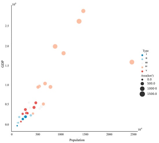 We then used the 2016 GDP and population figures for each city to preliminarily analyze whether cities with similar street forms also have similar economic development levels. The cities were plotted by projecting GDP and population into the two-dimensional space, with x- and y-axes representing GDP and population, respectively (Figure 5). Each point in the figure represents a city, with its color representing the cluster the city belongs to, and its radius representing the area of the city. As shown in Figure 5, points with the same color are concentrated, indicating that these cities are similar in economic and population development.