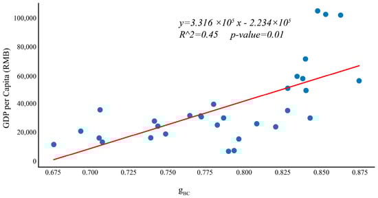 The above analysis suggests that cities’ street network structure can, to some extent, indicate economic development levels. To further validate the statistical significance of the observed relationship, a correlation analysis is applied to the GDP per capita and the Gini coefficient of street network centrality (Figure 6). Here we use GDP per capita index to eliminate the impact of city size on economic development. The results further confirm the relationship between street network structures and economic development level in that the Gini coefficient of street networks’ betweenness centrality is statistically significant for city economic development levels.