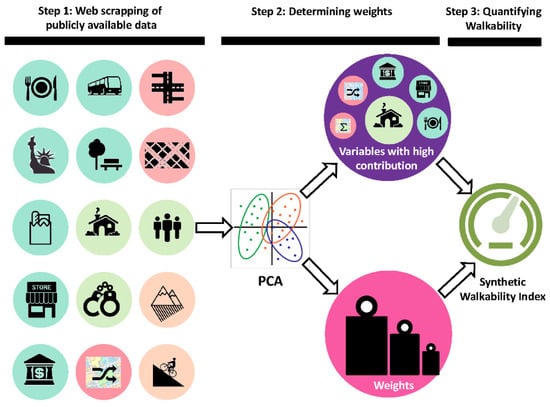 Moreover, the weight of each component is adaptively determined based on this proposed framework. This is done by using the variance derived from PCA as the weights for synthesizing the index. Comparatively, weights are determined in two ways in existing studies. The first is the usage of equal weights, which, for example, is used for Walk Score []. It is based on an assumption of equal importance of different categories of amenities. This may not adequately characterize the reality due to their considerably different impacts on walking. The second limitation is the subjective assignment of weights, which heavily relies on researchers’ local knowledge. Especially when studying different cities with different social structures and economic status, it may be very difficult to decide the appropriate weights in different study areas manually. Therefore, this framework helps adaptively determine weights of variables from online open datasets which characterize the varying impacts of different aspects of walkability.