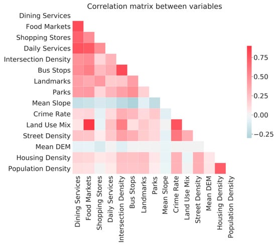 Table 4 lists the initial eigenvalues and total variance explained by each component. Four major components were selected as shown as bold fonts. Table 5 displays the rotated loading of each variable to each component. A rule of thumb is that loadings higher than 0.70 are considered excellent, between 0.55 and 0.7 are good, between 0.45 and 0.54 are fair, and lower than 0.45 are poor []. The first component has strong positive loadings (all higher than 0.8) on four POI variables: dining service, food markets, shopping stores and daily services. The first component is “amenity attractions”. With high positive loadings on housing density (0.967), population density (0.966), and crime density (0.686) the second component characterizes the “urbanization status”. The third component has strong positive loadings on “transportation connectivity”, with intersection density (0.901), bus stops density (0.880) and street density (0.753). The fourth component has strong positive loadings on land use mix (0.807), which can be interpreted as “land use diversity”. In addition, the correlation coefficient matrix in Figure 3 also supports the grouping of these variables in different components. Variables of amenity attraction have significant positive relationships with each other, with correlation coefficients ranging from 0.484 to 0.799. The two variables of urbanization density, i.e., housing density and population density, highly correlate to each other (with a correlation coefficient of 0.725). The three transportation variables, i.e., street intersections, intersection density and bus stops density, also correlate to each other with correlation coefficients ranging from 0.363 to 0.812. Nevertheless, the relationships between elevation/slope and other variables are not very strong, indicating that elevation might not have a great impact on walkability in this study area.