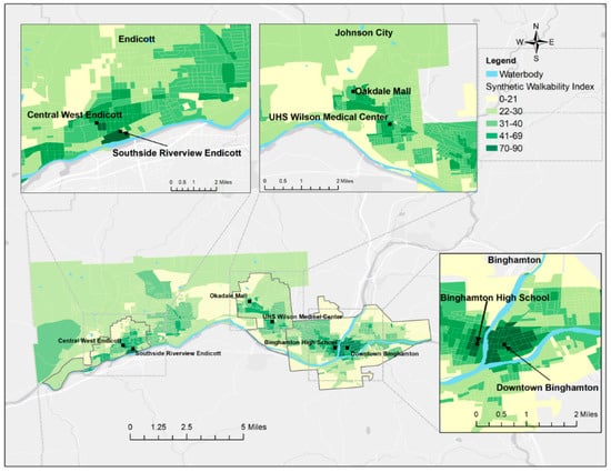 Despite the comparable results and high correlation between the synthetic walkability index and Walk Score, it can be clearly observed in Figure 7 (as highlighted with the orange boxes and arrows) that Walk Score tends to stop responding at locations with relatively high walkability (e.g., it does not go beyond a score of 80), where the synthetic walkability index remains responding. This may suggest a higher sensitivity of the proposed synthetic walkability index than Walk Score in our study area. Also, by examining the scatterplot in Figure 7 together with the distributions in Figure 6, Walk Score seems to slightly underestimate most of the locations in our study area, while the synthetic walkability index, on the contrary, appears to match our local knowledge that three urban cores of this area should be associated with a relatively high walkability value. In New York State, depopulation occurred in a range of cities of the state’s regions, including the New York City metropolitan region and Upstate New York communities. The impacts are striking in many ways, including differential reinvestments by both public and private sectors. This realization led to Governor Cuomo’s recognition that Upstate communities lagged behind Downstate communities, and a State policy was needed to address the differential. A New York Upstate Revitalization Strategy involved a competition for financial awards exclusively for the Upstate area. The grand prize involved an award of $500 million for revitalization of a single region. That award was made to the Southern Region of New York, which includes Broome County and the Triple Cities. The Southern Tier Regional Development Council created the regional development project. One of the most important goals involved a strategy for creating three innovation districts (or iDistricts), one in each of the Triple Cities, with the intention of redevelopment of the old urban core by “Placemaking” and “Downtown Revitalization”. This meant locating in the areas in and near the old central business districts (CBD) and their nearby surrounding neighborhoods that had been hard hit by the depopulation that had suffered from the concomitant negatives expressed by the indicators previously noted in Table 1. The literature has increasingly paid attention to the differential spatial impacts within cities, small and large [,]. Some neighborhoods within the city suffered more from the forces associated with depopulation and job losses than others. Certainly, these include neighborhoods in old industrial and near-CBD areas. The Council defined the three iDistricts and the newly defined iDistricts contain such neighborhoods. The revitalization plan focuses on the attracting innovative businesses and an innovative anchor that drives the attraction of new business and employment to the area. Binghamton University provides an anchor for each of the iDistricts and became the driver of redevelopment based on its professional schools. This observation from comparisons in Figure 6 and Figure 7 suggests that the performance of Walk Score may be adequate in cities with high population density, but might need further improvements and adjustments in areas with a small population [], such as the shrinking metropolitan area in this research. In areas with very different social and economic structures, fewer neighborhood amenities can be derived, the primary inputs to calculate Walk Score, which might lead to a less satisfactory estimate in such areas. Alternatively, the synthetic walkability index does not rely heavily on amenity, but also considers the impacts of other relevant factors, such as population density, crime, and land use mix.