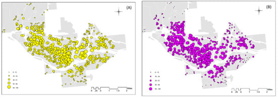 This study extends the research topical areas in the literature. A variety of metropolitan areas have been investigated in previous walkability studies. Examples include New York City [], Atlanta [,,], Los Angeles [], Seattle [,], Portland [], Indianapolis [], San Francisco [,,], San Diego [,,], Gainesville [], Minneapolis–St. Paul [], and Adelaide, Australia []. Unlike existing studies using cities with a large population, our study focuses on a metropolitan area with three typical small shrinking cities in the northeastern U.S. with a smaller population and high obesity prevalence. Population size differences are one issue, and depopulation hits harder on cities with a small population. Due to the relatively low socioeconomic status in many small shrinking cities in the U.S. and other countries, the research outcomes from this study could provide guidance for quantifying walkability in a data-driven manner in these post-industrial cities.