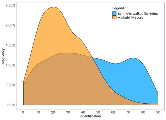 The distributions of synthetic walkability index (blue) and Walk Score (orange) with the same random samples in Binghamton.