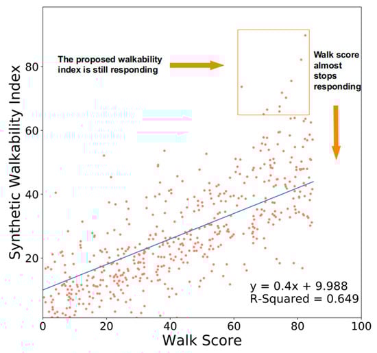 To evaluate the performance of the synthetic walkability index based on the proposed framework, values of Walk Score were extracted from its website (www.walkscore.com). Walk Score is a walkability metric with a range from 0 to 100 in a limited number of countries. Five categories of amenities are used to obtain Walk Score, including retail (e.g., convenience, drug, grocery, and bookstores), educational (e.g., schools), dining (e.g., restaurants), entertainment (e.g., movie theaters), and recreational (e.g., gyms and parks). It is calculated as a weighted score of Euclidean distances to various nearest amenities, but it remains unknown how the weights are decided. This metric has been used in several applications in different fields [,,]. For comparison purposes, five hundred samples of different addresses in the Triple Cities Area were randomly selected. Values of Walk Score of these random samples were retrieved using the API provided by their website. The synthetic walkability indices of these samples were then compared with the values of Walk Score at the same location. Comparisons between synthetic walkability index and Walk Score were performed for evaluation by using the same random samples.