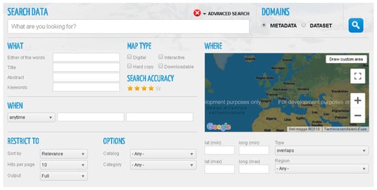 An advanced system of data querying allows users to access information through multivariable queries. The data search is divided in two principal domains “Metadata” and “Dataset”. Choosing the metadata domain, the user can query the metadata available for the collected data and measures relative to mountainous regions selected (Figure 4). This selection can be done based on different criteria such as keywords, title, geographic coordinated, time and so on, showing the data location on an interactive map.