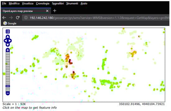 Data visualization is possible with the adoption of the previously described GeoServer that is integrated in the GeoNetwork. With this software, it is possible to publish and edit geo-referred information on the web. Data can be stored into common relational/spatial datasets or file systems and exported as a web service. Many clients could use those services. Some visualization tools are integrated in the GeoServer software (i.e., a fresh installation comes with OpenLayers libraries and a web mapping interface to preview the data loaded into the system), others could be chosen by the final users thanks to the adoption of standard protocols and formats defined by the Open Geospatial Consortium (OGC). i.e., WMS, WFS, WCS. As an example, GeoServer can display data on any of the popular mapping applications, such as Google Maps, Google Earth, Yahoo Maps, and Microsoft Virtual Earth (Figure 9). Moreover, GeoServer can connect with traditional GIS architectures such as Earth ArcGIS and QGIS (Figure 10). This flexibility makes GeoServer interoperable with many different platforms, making it one of the best FOSS for data visualization (Figure 11).