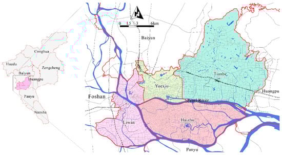 The study area is located at the center of downtown Guangzhou (China), including the districts of Liwan, Yuexiu, Tianhe, and Haizhu (Figure 1), which are the only 4 districts of the 11 in Guangzhou with an urbanization rate of 100%. The total land area is about 279.63 km2, accounting for 3.76% of the whole city. Yuexiu and Liwan are traditional old towns with small areas of 33.8 and 59.1 km2, respectively. Considerable parts are newly built in Tianhe and Haizhu, which cover large areas of 96.33 and 90.4 km2, respectively. According to data from the Guangzhou Municipal Bureau of Statistics, at the end of 2017, Tianhe had the largest population at 1,679,900, followed by Haizhu and Yuexiu, with 1,663,100 and 1,163,800, respectively, and Liwan had the smallest population of 950,000.