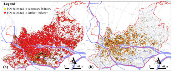 In this study, the main data type used was POIs, which were collected from the Baidu Maps open platform in early 2018. The POIs data were divided into 14 categories and 524 subcategories, including catering services, scenic spots, enterprises, shopping services, transportation facilities, finance and insurance, education and culture, business housing, living services, sports and leisure, health care, government agencies, accommodation services, and public facilities, which basically cover all kinds of facilities that citizens can access. The POIs (Figure 2a) totaled 145,084, each of which contained information such as name, category, address, district, and coordinates of the facilities. Another data type is the distribution of residential quarters, apartments, and dormitories (Figure 2b) from a real estate transaction company, the data attributes included name, address, coordinates, number of buildings, number of households, and property company, for a total of 4533 pieces of information. Official statistics of practitioners in various industries from yearbooks of Liwan, Yuexiu, Tianhe, and Haizhu were used as auxiliary data.