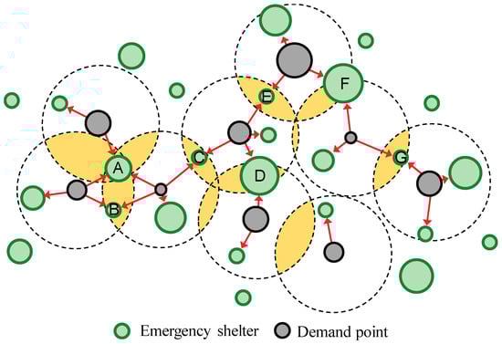 The balance of supply and demand in emergency shelters is important for effective disaster mitigation functions during disasters and in the evaluation of shelter service capacity. In the traditional practices of shelter planning, supply and demand are generally balanced by districts, rarely seen on streets. A problem that arises is that the probability is high that the supply and demand of certain small areas within the city may be unbalanced, and the service gap could be large. Therefore, we aimed to establish an evacuation simulation model between evacuees and shelters, and tried to simplify and implement complex and dynamic evacuation activities. In principle, the evacuation simulation solves a problem of evacuee assignment from the start to the destination, which can also be understood as a multi-objective allocation problem. The plots where the evacuees located are demand points (the starts), and the plots where the shelters are located are the destinations. Figure 3 shows that some demand points are covered by multiple available shelters; one shelter may also cover multiple demand points. For example, shelters A, B, C, D, E, F, and G, all serve more than one demand point. The objectives of the simulation model are as follows: