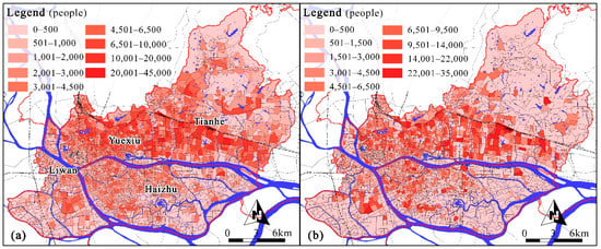 Figure 4 shows the distribution and size of the day and night population. The population is generally composed of residents and floating population. In addition to the working population in various industries, the people who are present during the daytime also include the elderly, primary and secondary school students, vocational and technical school students, college students, and inpatients in general hospitals, of which the number of the elderly was estimated using the proportion in the community, which is 7.9% according to the Main Data Bulletin of 2015 National 1% Population Sampling Survey in Guangzhou released in 2016; other types of population data were obtained from the statistical yearbooks of each district. During the day, the floating population includes the people distributed in passenger stations, scenic spots, megamalls, and large gymnasiums. The population at night are mainly people in residential quarters, apartments, and dormitories, and other residents, such as business travelers in brand chain and star hotels, students in vocational and technical schools, students in higher education institutions, and inpatients in general hospitals. Due to the smaller mobile populations at night, they were excluded from the analysis.