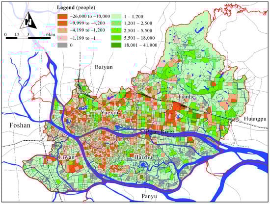 Figure 5 shows the change in the day and night time population of the plots (the number of people in the daytime minus the number at nighttime). In terms of the intensity of the change, the population changes in Haizhu, Liwan, and Tianhe are greater, whereas the day and night population in Yuexiu is basically the same. In terms of the extreme value of the change, the population in partial plots in Tianhe varies considerably between day and night. After a frequency statistical analysis of the change value, we found that the majority of the plots had a change value between 0 to 2000, followed by the plots with a change value between −2000 to 0; the remaining plots with an obvious change value were those distributed between −4000 to −2000, 2000 to 4000, and −6000 to −4000.