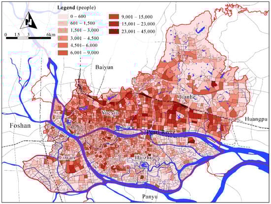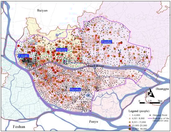 To provide shelter for evacuees both during the day and at night, the shelter demand was determined by applying the high values of the day and night population in the plots, and the final distribution of shelter demand is shown in Figure 6. The total demand is about 7.93 million people, including in Haizhu, Liwan, Tianhe, and Yuexiu, with a 2.36, 1.26, 2.39, and 1.91 million, respectively. The total demand is 2.45 million higher than the resident population (5.48 million) in the study area, which indicates that the population has a strong regional mobility, and a serious gap exists between shelter capacity and potential number of evacuees. Figure 6 shows that the shelter demands in Tianhe and Yuexiu, which have plentiful urban service functions, are significantly higher than the other two districts. In the old urban areas, due to the weakening of functions and the reduction of employment positions, the demand is lower than in newly developed areas.