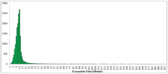 The frequency distribution of evacuation time required for all routes.