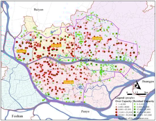 Additional statistics were used to analyze the supply and demand for shelters in each district, as shown in Table 7. In terms of the shelters that exceeded their capacity, Haizhu is the largest with 1.62 million people, mainly concentrated in the old urban areas in the west, followed by Yuexiu, Tianhe, then Liwan. Haizhu provides the largest effective shelter area, but given the uneven distribution of the resources for shelters, the capacity of shelters varies in different areas. In general, the shelters in central and western regions exceed capacity, whereas the eastern shelters have residual capacity due to their larger average size. Shelters in Tianhe can accommodate more people for refuge, with 890,000 people, followed by Haizhu and Yuexiu. Tianhe and the eastern part of Haizhu, as newly developed areas, have more green space coverage, so the shelters in these areas also have larger residual capacity. The residual capacity in Tianhe is distributed outside the core central business district (CBD), and that of Haizhu is mainly distributed in the eastern part. Overall, many shelters exist in each area that either exceed or do not exceed the maximum capacity, indicating that the imbalance between supply and demand of shelters within the districts is widespread. In the future, new resources should be added near the over-capacity shelters, or the capacity of the existing shelters should be increased.