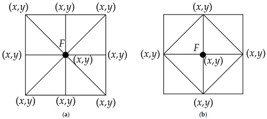 The parameters that appear in Equations (7) and (8) are limited to the x- and y-coordinates of vertices that form the same triangles or edges with vertex F. Figure 2a shows the case when the number of parameters is a maximum of 18, and Figure 2b shows the case when the number of parameters is a minimum of 10 if surrounding vertices are not on the outer border of table cartograms. The number of nonzero coefficients is small in the linear system that is composed by Equations (7) and (8), then the system is represented by a sparse matrix.