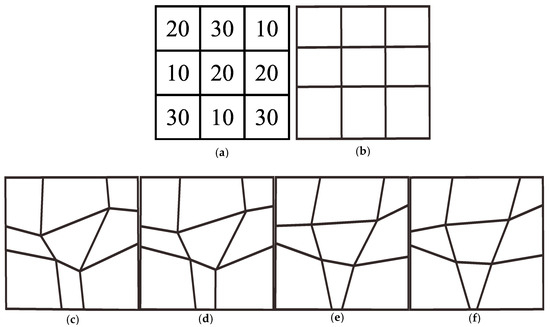 The effect of initial values of weight μ was tested by a simple table. Figure 3a,b show, respectively, the original table for input and the table cartogram output by Step 1 with vertical and horizontal lines. Figure 3c–f show the resultant quadrilateral table cartograms by different initial μ values.