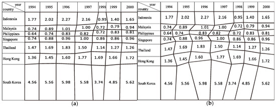 Quadrilateral table cartograms of Gross Domestic Product( GDP) (10 billion current USD) of Eastern and Southeastern Asian countries before and after the Asian financial crisis in late 1990s: (a) Proposed method; (b) Previous method in [8].