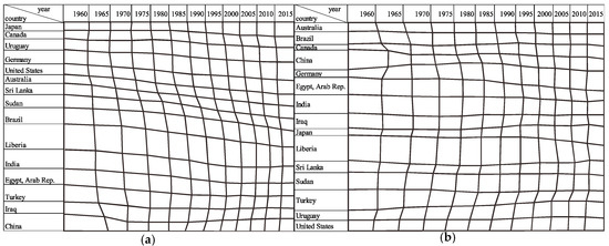 Quadrilateral table cartograms of death rate crude per thousand people by proposed method: (a) Rows are sorted by the proposed sorting method; (b) Alphabetical order of country names.