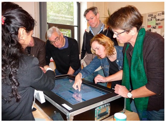 A particular type of PSS aiming to enable the collaboration of stakeholders are PSS developed for interactive surfaces, so-called interactive PSS. These interactive PSS are hardware systems in the form of a touch-sensitive table, a maptable, combined with geospatial mapping and analytical tools to support group processes []. Such interactive PSS provide a platform for discussing spatial problems or evaluating planned alternatives using a shared map interface to facilitate interaction among stakeholders []. Through their interactive nature and user-friendly interface a maptable might facilitate exchange of knowledge and preferences between stakeholders [], consensus building among them [], and group learning about complex problems [,], among others.