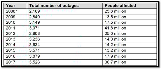 When Hurricane Irma hit Florida, it impacted about five million customers in districts where Florida Power & Light operates [14]. Peter Maloney commented that “Miami-Dade County was hit hardest. At one point, more than 815,000 people, or 80% of FPL accounts in the county, were without power” [15]. According to Maloney, other jurisdictions in Florida, such as Palm Beach and Broward County, also showed loss of power in about 68–70% of accounts, due to the hurricane [15]. Figure 1 sketches the yearly total number of outages in the United States and people affected since 16 February 2008 [16] (p. 3).