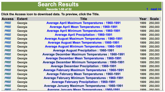 - Georgia spatial data infrastructure (GaSDI) and the Georgia GIS Clearinghouse is the data source for the monthly temperature and precipitation data we employed in this study. “This dataset contains contours that represent the average monthly temperatures (1960–1991) for the state of Georgia [and] display appropriate at least at regional scales and above” [26]. The data repository is displayed in Figure 4.