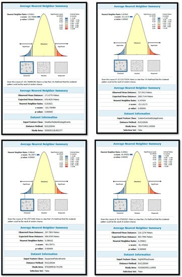 ArcGIS average nearest neighbor analyses results for four types of outages: weather (top left), system overload (top right), equipment (bottom left), and right of way (bottom right).