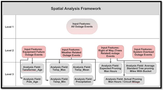 We developed the following framework (Figure 9) to guide the investigation and illustrate the various levels of analysis. At the first level, all features in the outage events are analyzed to provide a general sense of where in space the clusters of outages might be. As we get more refined in the granularity of the data, Level 2 indicates a more specific group input features, namely types of outage events. In this case, there are four: equipment failure, weather, right of way, and system overload. As the analysis drills down to finer details, Level 3 approaches each individual feature in each type and in turn, provides the analysis for a particular feature. Using this framework, the subsequent sections provide the implementation and the results of each level. Specifically, we use optimized hot spot analysis for all levels and emerging hot spot analysis for Level 1 and Level 2. These are meant to demonstrate how such a framework could apply to other similar scenarios.