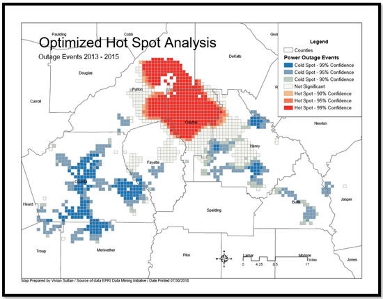 Based on Level 1 of the spatial analysis framework, we used ArcGIS optimized hot spot analysis tool to generate a map (Figure 10) of statistically noteworthy hot and cold spots using the Getis-Ord Gi* statistic. Since we did not identify an analysis field, this tool assessed the characteristics of the input feature class (power outage events) to produce optimal results [27]. The tool showed one large area of hot spots in Clayton and Fulton County where power outage was statistically significant due to multiple causes. As for cold spots, they appeared in counties such as Coweta, mid and South Fayette, Butts, North Meriwether, and a majority of Henry County.
