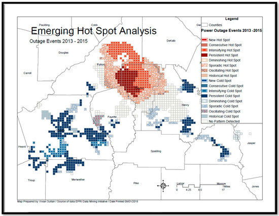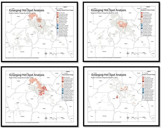 Based on Level 2 of the spatial analysis framework, we generated an additional four map layers (Figure 13) using the emerging hot spot analysis tool by consecutively selecting the input feature classes “system overload power outage events,” “equipment failure outage events,” “weather related outage events,” and “right of way (trees related) outage events.”