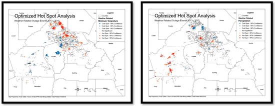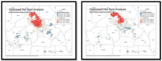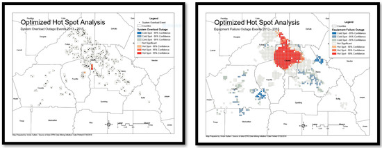 Based on Level 2 of the spatial analysis framework, we generated an additional four map layers (Figure 12) using the optimized hot spot analysis tool by consecutively selecting the input feature classes “System overload power outage events,” “equipment failure outage events,” “weather related outage events,” and “right of way outage events.”