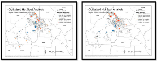 Spatial Analysis Level 3—Optimized Hot Spot Analysis output maps for each weather type outage events. Top left: maximum temperature; top right: mean temperature, bottom left: minimum temperature; bottom right: precipitation.